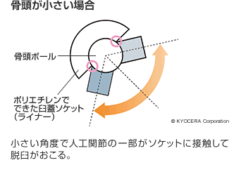 A. 手術手技におきましては、なるべく皮膚の切開を小さくする侵襲(しんしゅう:体を傷つけること)の少ない手術(MIS)ですね。それと人工関節を入れる際に筋肉を傷めない手技が考案されて、普及しはじめています。人工股関節自体もポリエチレン部分の技術の進歩で、以前に比べて骨頭径の大きな人工股関節が使えるようになりました。スポーツをするためにはある程度の可動域(かどういき:人工関節が脱臼を起こさずに動くことができる範囲)が必要で、そのために大きな骨頭を採用するのが有効なんです(下図参照)。