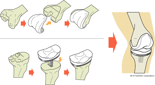 A. 後十字靭帯を温存するタイプと切除するタイプがあります。後十字靭帯を温存するタイプのほうが骨を切る量が少なくて済みますし、膝の生理的な動きを確保することができます。しかし、すでに靭帯が切れている場合や、傷みがきつくて変形も顕著なときは、後十字靭帯を切除する人工膝関節を使うほうが安定し、変形自体も矯正しやすいのです。このように、人工膝関節については単顆置換術も含めて段階に応じて選んでいくということになります。