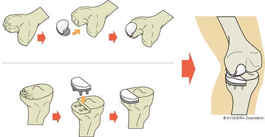 A. はい。でも、その人工膝関節にも種類があるんです。高齢の方で内側だけが傷んでいる場合は、その半分だけを人工物に換える単顆型人工膝関節置換術(たんかがたじんこうひざかんせつちかんじゅつ)を、膝の外側も内側も傷んでいる場合は全人工膝関節置換術(ぜんじんこうひざかんせつちかんじゅつ)をお勧めしています。
