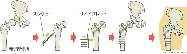 A. 骨接合術(こつせつごうじゅつ)といってCCHSというスクリューを3本くらい入れる方法、またはCHSというサイドプレートの付いたネジで留める方法があります。
