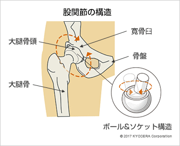 A. 股関節は骨盤と寛骨臼(かんこつきゅう)から成り、骨盤の先端にある大腿骨頭というボール状の骨が受け皿となる寛骨臼の中で動く構造になっていて、周囲の関節包(かんせつほう)や靭帯が動きを安定化させています。